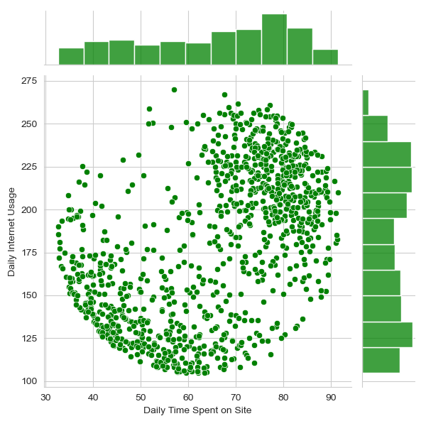 - Daily Time Spent on Site vs. Daily Internet Usage: The joint scatter plot reveals a positive correlation between the time spent on the site and daily internet usage.