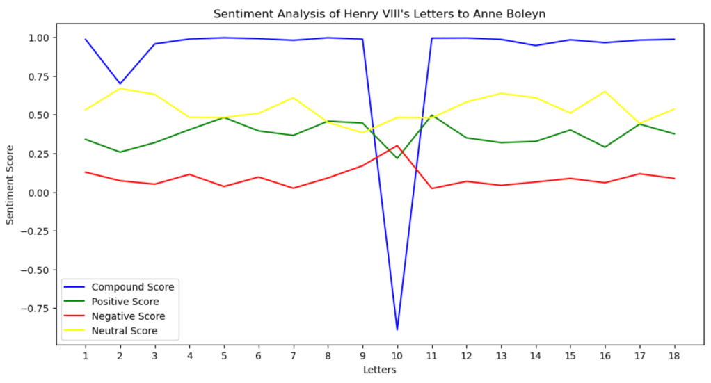 Applied Natural Language Processing techniques to analyze historical correspondence between Henry VIII and Anne Boleyn. Utilized Python and NLTK for sentiment analysis, revealing emotional patterns and thematic elements. Created visualizations to track sentiment changes across letters, identifying key emotional shifts and religious references.